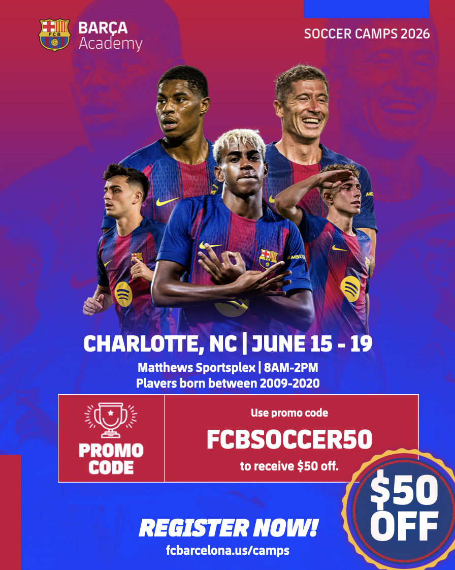 Barca Academy is hosting the 𝗼𝗳𝗳𝗶𝗰𝗶𝗮𝗹 𝗙𝗖 𝗕𝗮𝗿𝗰𝗲𝗹𝗼𝗻𝗮 𝗦𝗼𝗰𝗰𝗲𝗿 𝗖𝗮𝗺𝗽 𝗶𝗻 𝗖𝗵𝗮𝗿𝗹𝗼𝘁𝘁𝗲, 𝗡𝗖, from June 15 to June 19, 2026. The camp will take place at 𝗠𝗮𝘁𝘁𝗵𝗲𝘄𝘀 𝗦𝗽𝗼𝗿𝘁𝘀𝗽𝗹𝗲𝘅, running from 𝗠𝗼𝗻𝗱𝗮𝘆 𝘁𝗼 𝗙𝗿𝗶𝗱𝗮𝘆 𝗳𝗿𝗼𝗺 𝟴 𝗮.𝗺. 𝘁𝗼 𝟮 𝗽.𝗺. Kids will experience 5 days of training with official FC Barcelona coaches.